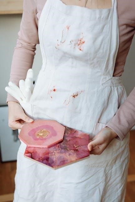 When working with Mod Podge Resin, it’s crucial to wear appropriate protective gear to ensure safety․ This includes nitrile gloves to prevent skin contact, safety goggles to protect eyes from splashes, and a dust mask or respirator to avoid inhaling fumes; A well-ventilated workspace is essential to prevent the accumulation of harmful vapors․ Keep a fire extinguisher nearby and avoid working near open flames or sparks․ In case of spills, have paper towels or absorbent materials ready for cleanup․ Always refer to the Safety Data Sheet (SDS) provided by Plaid for detailed safety precautions and emergency procedures․ Proper safety measures ensure a safe and enjoyable crafting experience․